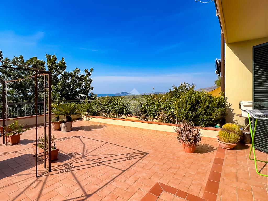L'ampia terrazza regala una vista panoramica spettacolare sul mare e sulla città, aggiungendo un elemento di grande valore all'appartamento.