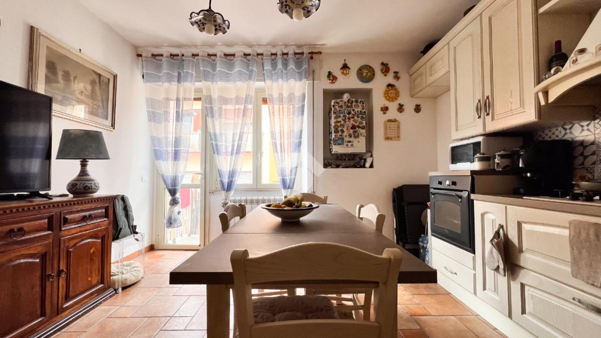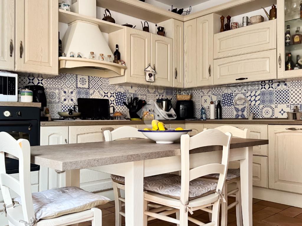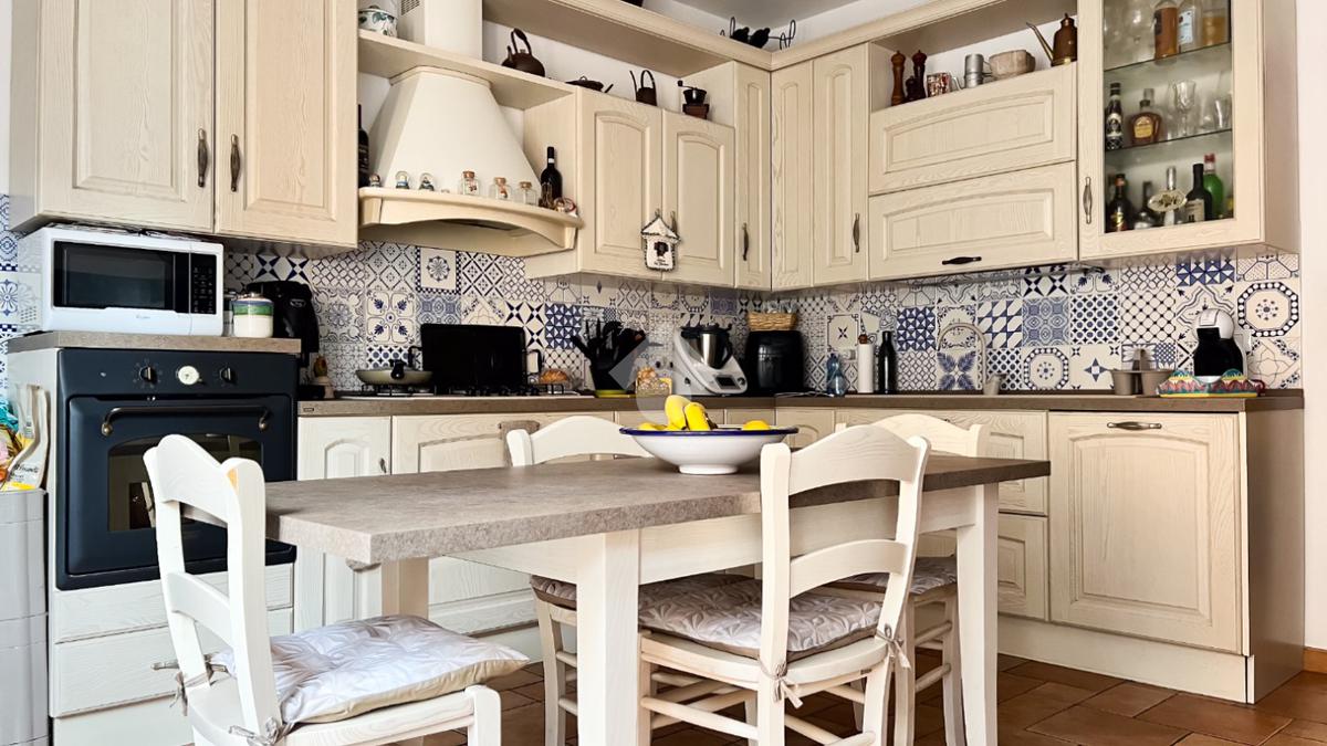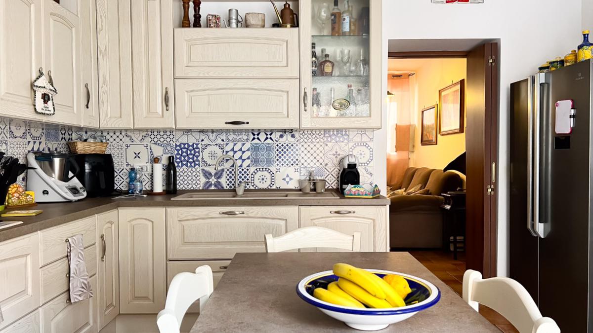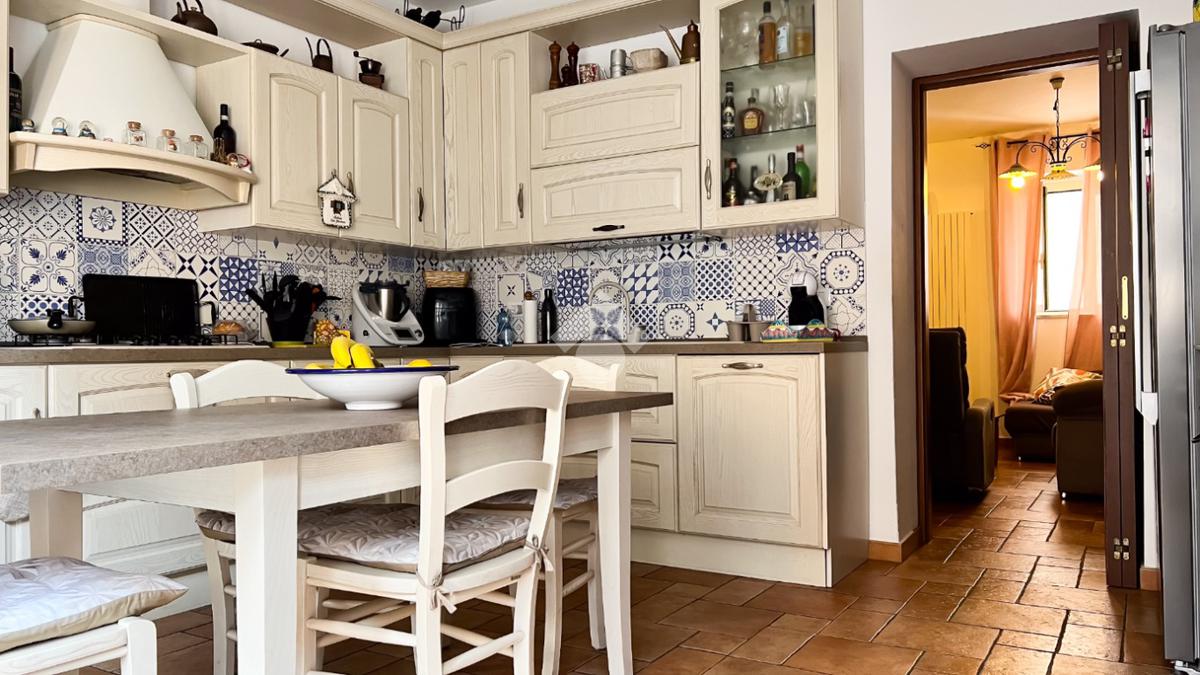 L’ingresso si apre sul soggiorno, luminoso e ben organizzato, collegato alla cucina abitabile dotata di balcone.