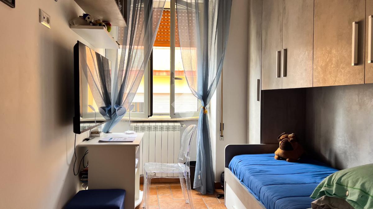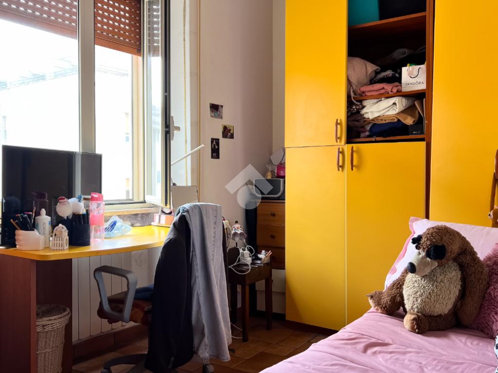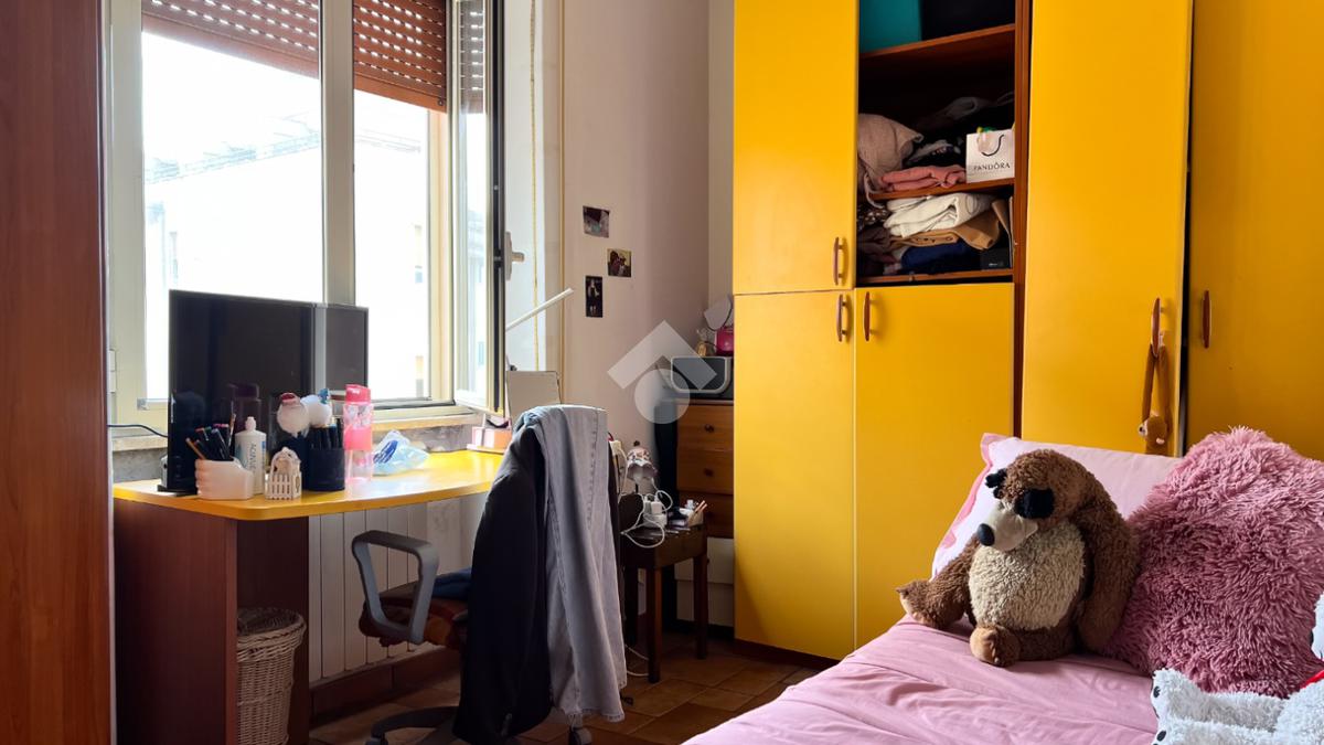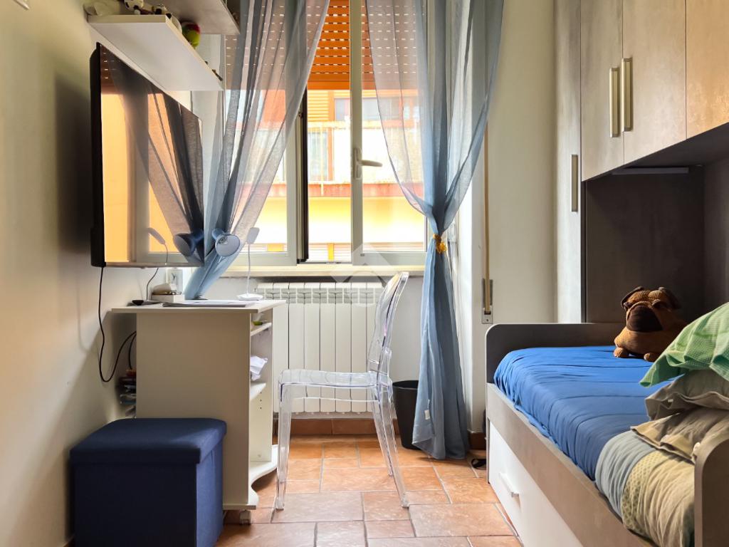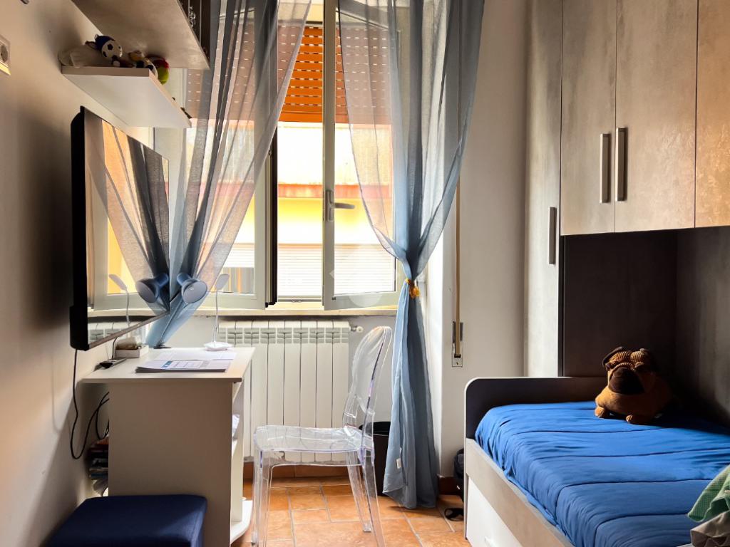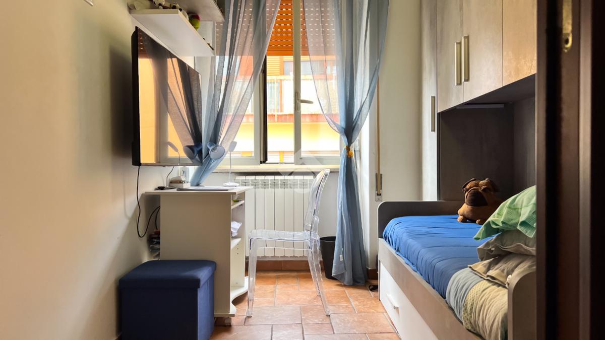 Un disimpegno, con porta vetrata, separa con eleganza la zona giorno da quella notte, dove troviamo una camera matrimoniale, due camerette e un bagno con box doccia.