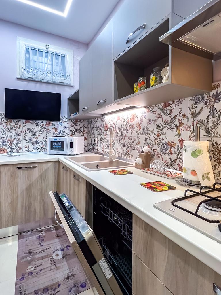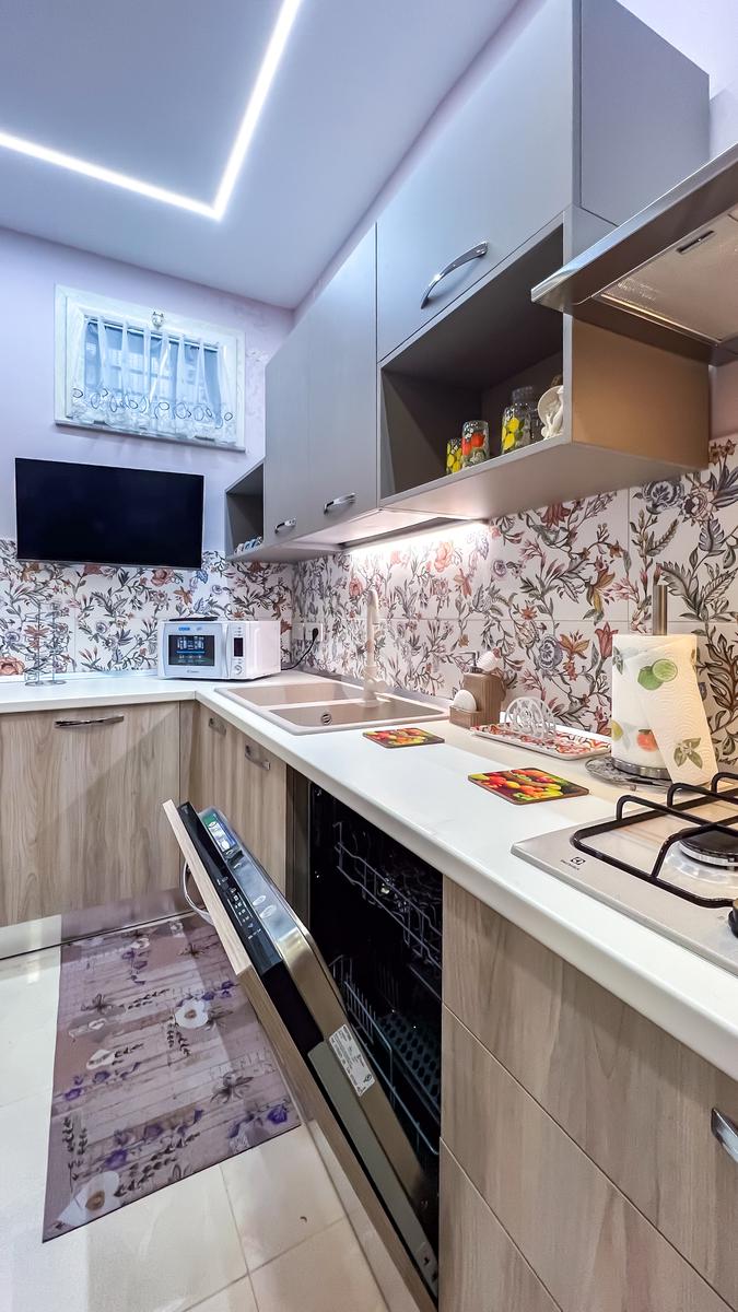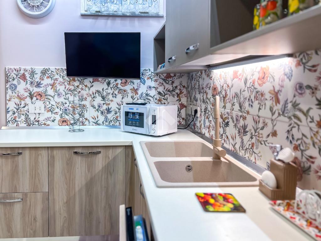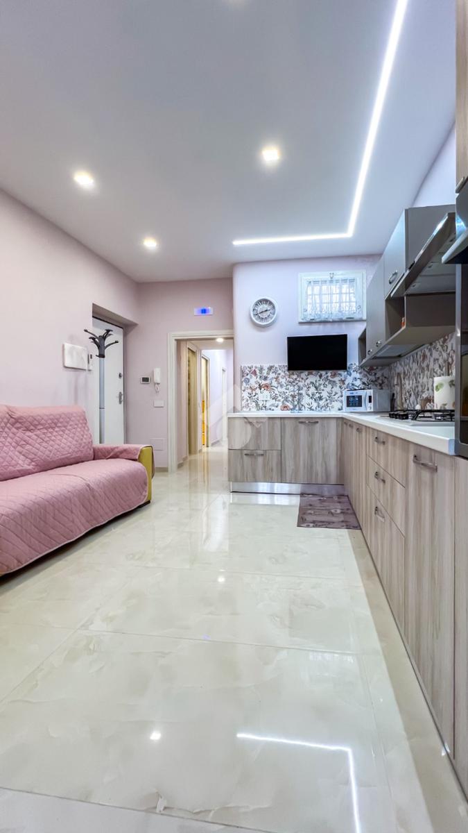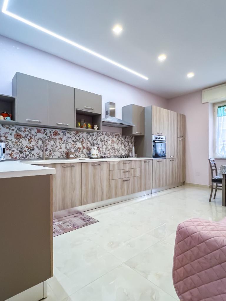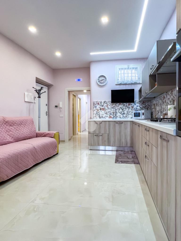 La zona giorno accoglie con un soggiorno con angolo cottura, valorizzato da luci a soffitto che creano un ambiente piacevole e curato, ideale per vivere la quotidianità con ordine.