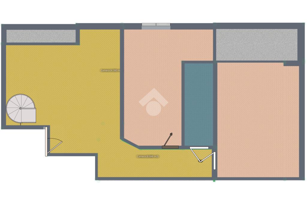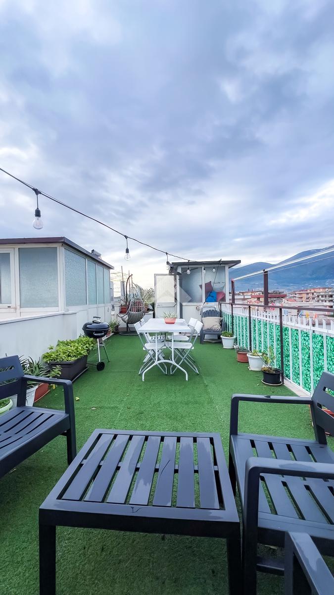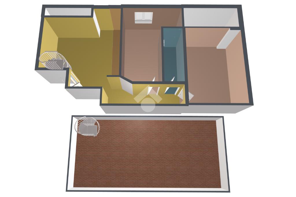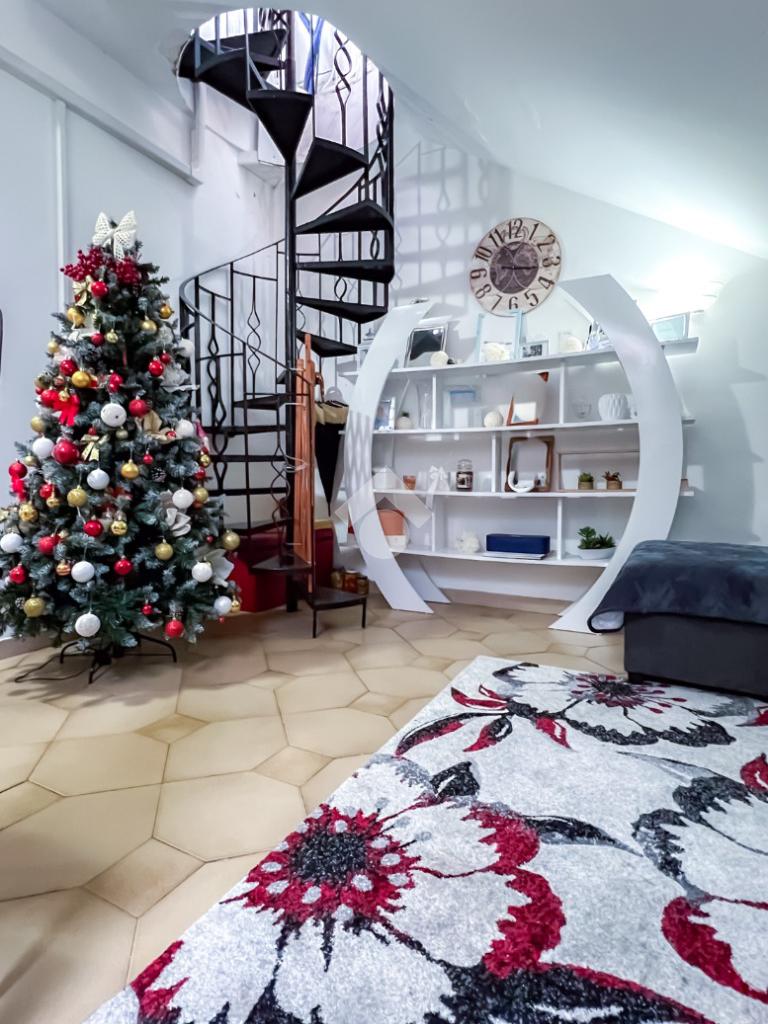Una scala a chiocciola interna collega al terrazzo panoramico, ideale per momenti di relax, convivialità o semplicemente per godere della vista aperta.