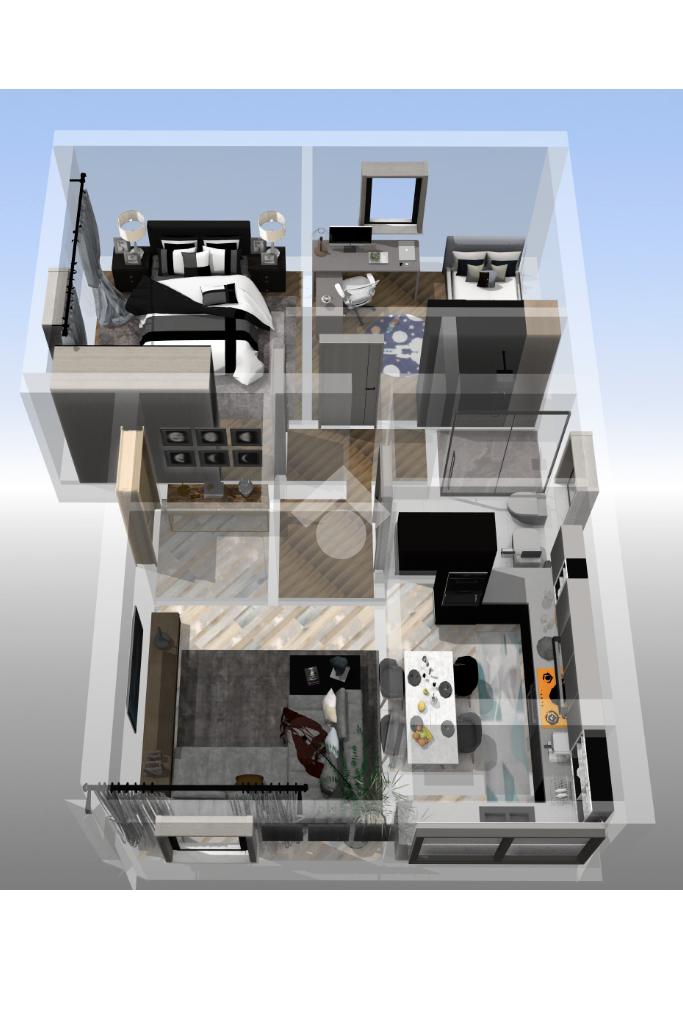 L’immobile si estende su 65 mq commerciali ed è composto da un ingresso con ampio disimpegno che conduce alla zona living, comprendente un soggiorno con angolo cottura e vista sul belvedere.