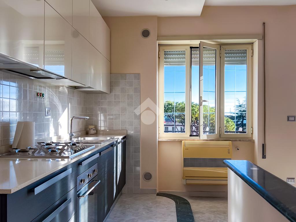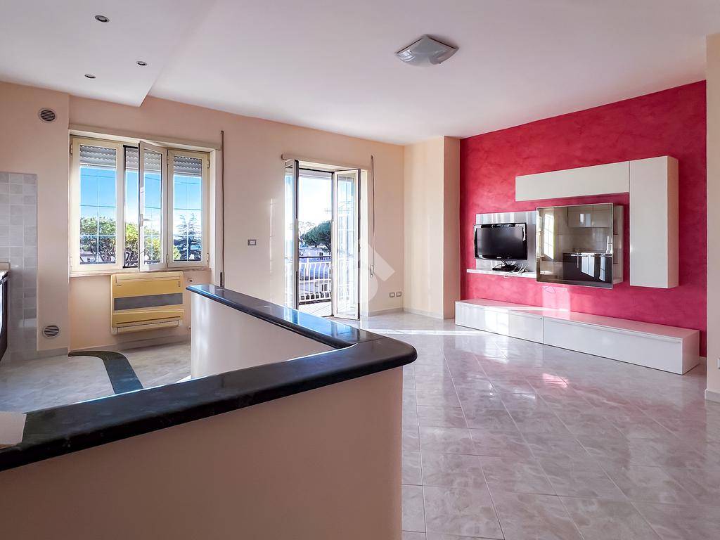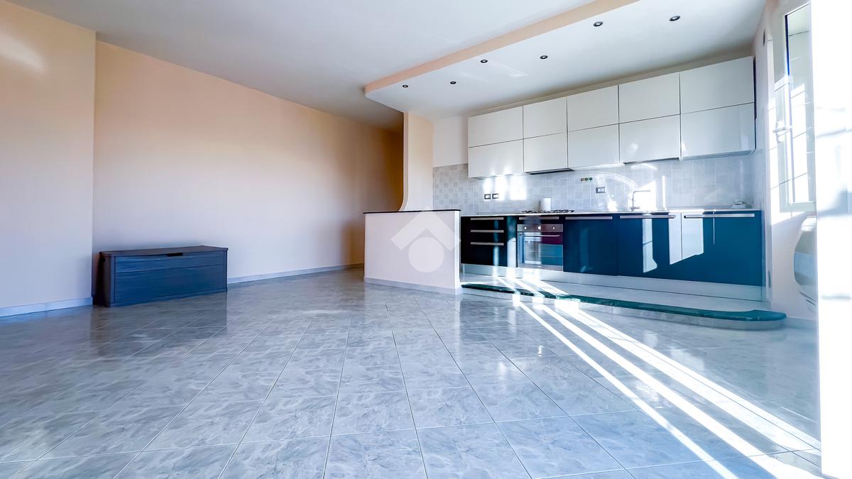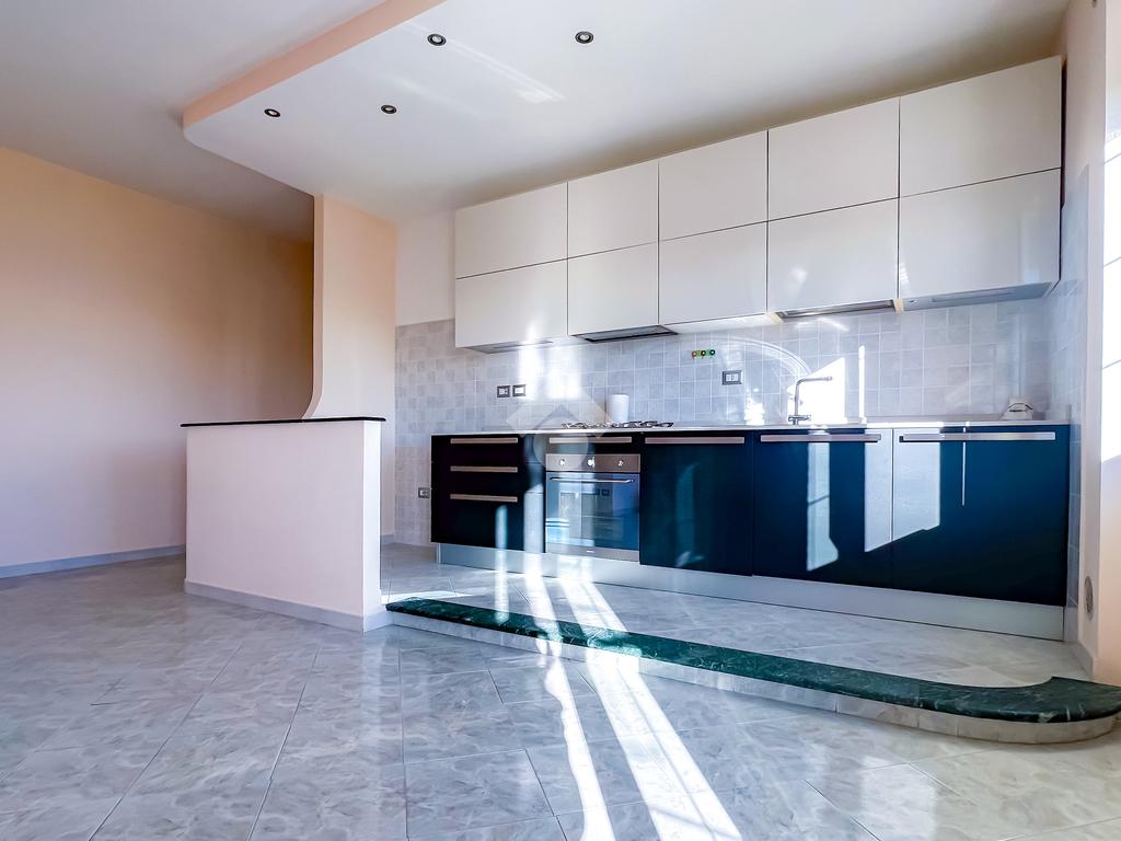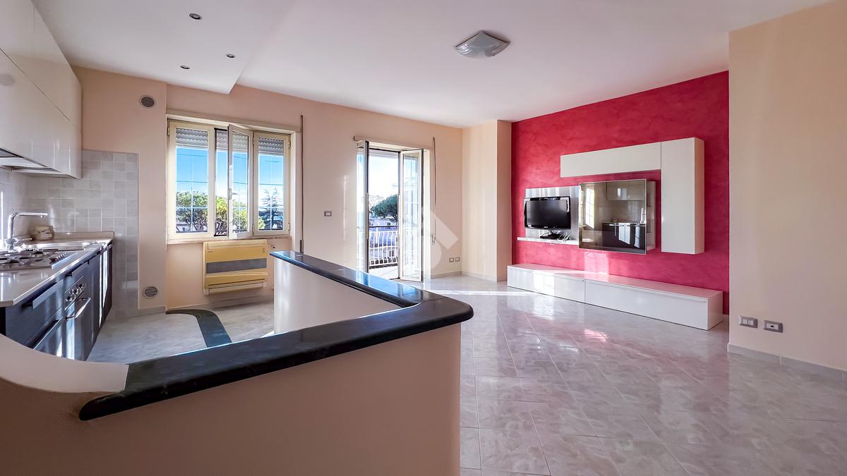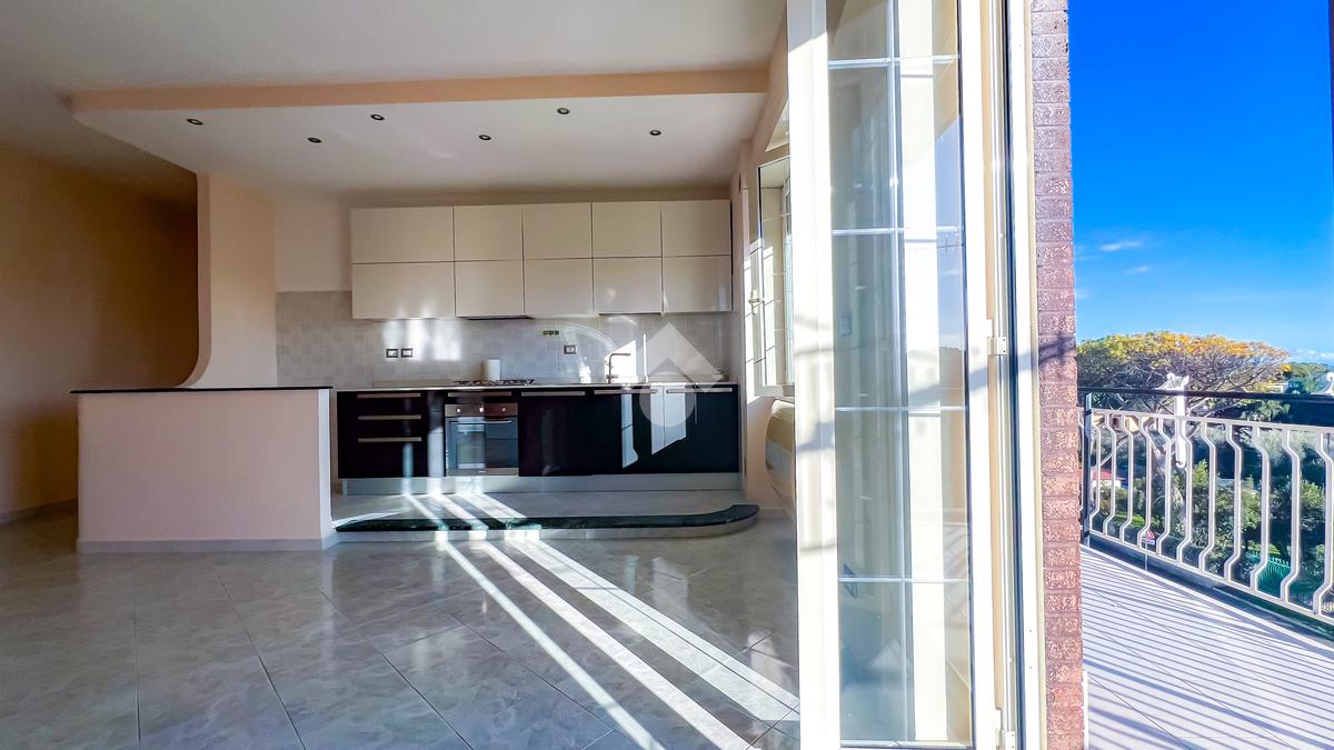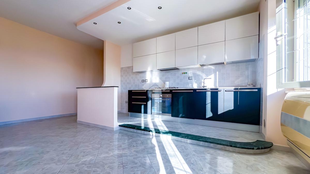 Sulla destra si sviluppa il soggiorno con angolo cottura, luminoso e ben proporzionato, con uscita diretta sulla balconata abitabile, ideale come naturale estensione della zona giorno.