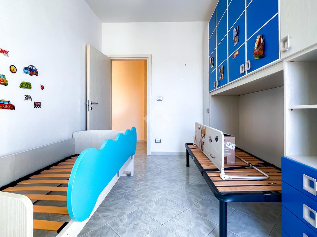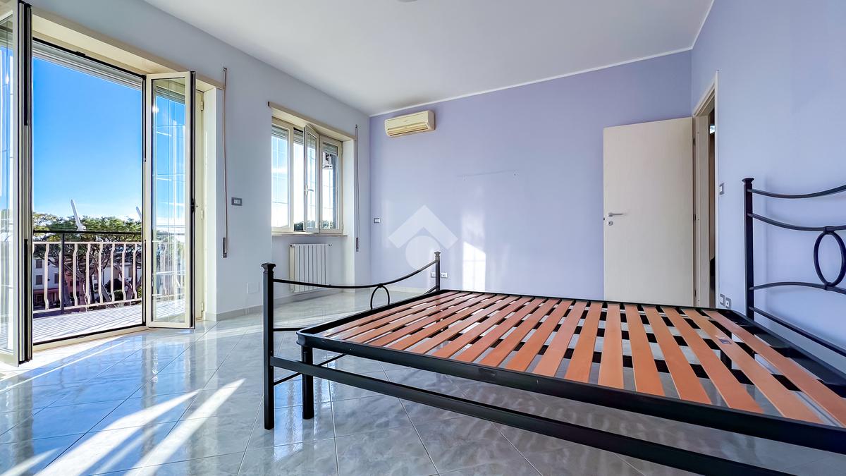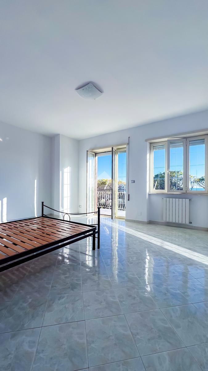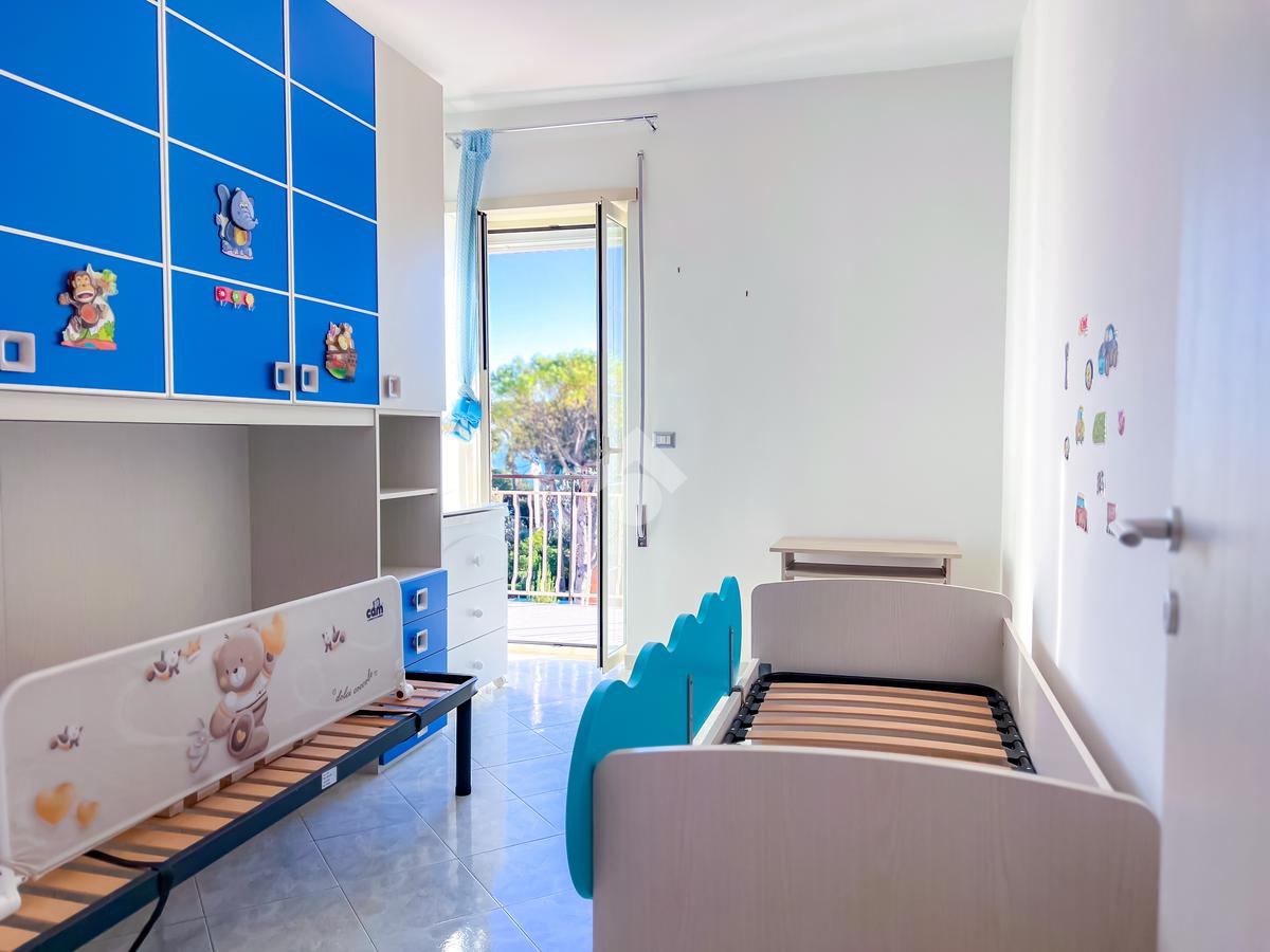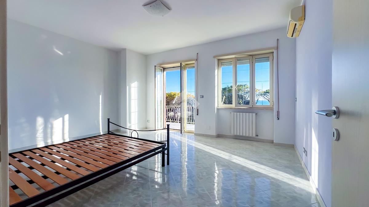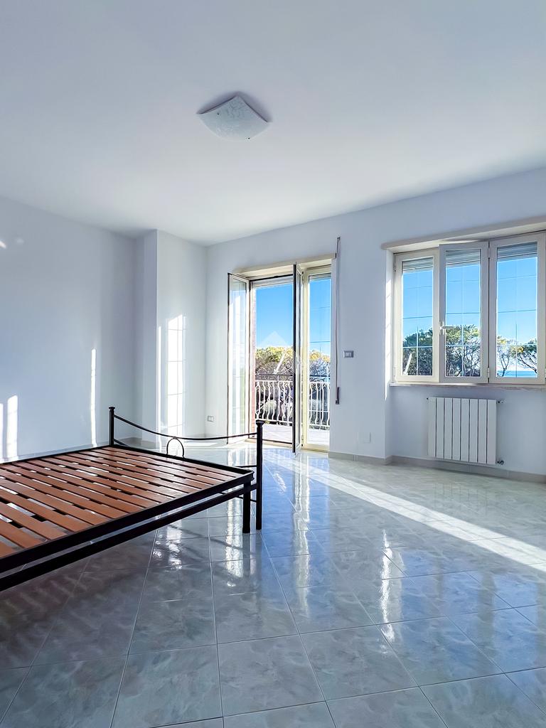 Proseguendo, sulla sinistra, si accede alla zona notte, composta da camera matrimoniale e cameretta, entrambe collegate allo spazio esterno. L’esposizione completamente a sud garantisce luce e una vista mare aperta, elemento distintivo dell’abitazione.