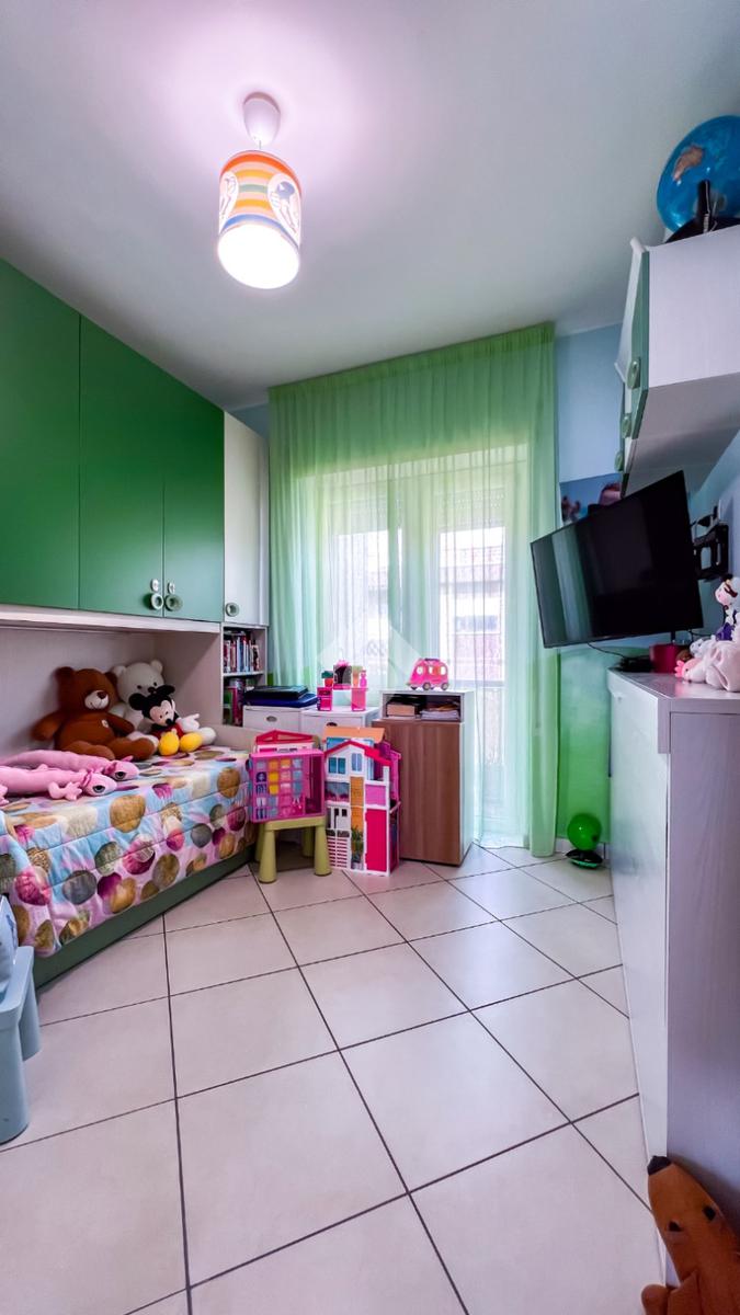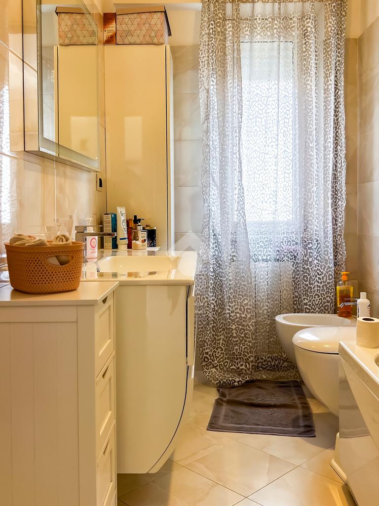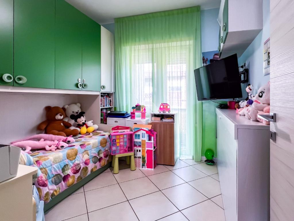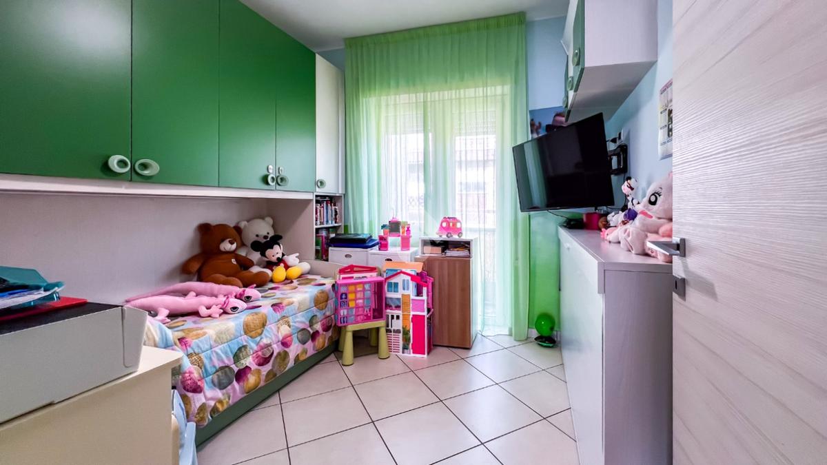 La zona notte comprende una camera matrimoniale e una cameretta, entrambe con uscita sui balconi abitabili, così come il soggiorno, garantendo luce naturale e piacevole ventilazione in tutti gli ambienti. Completano la proprietà due bagni finestrati — di cui uno con vasca — e un pratico ripostiglio.