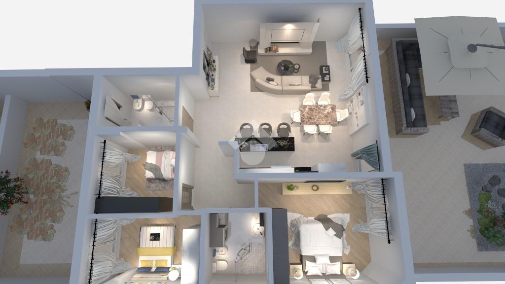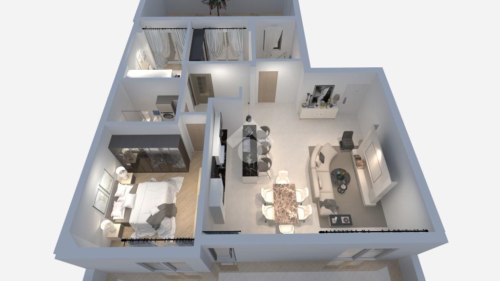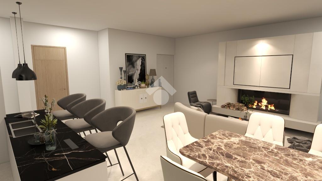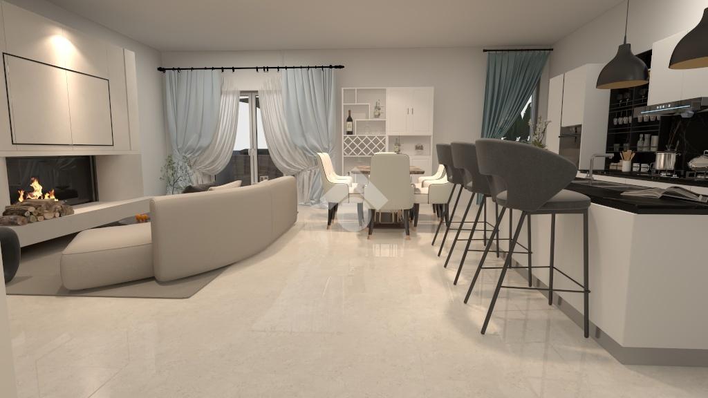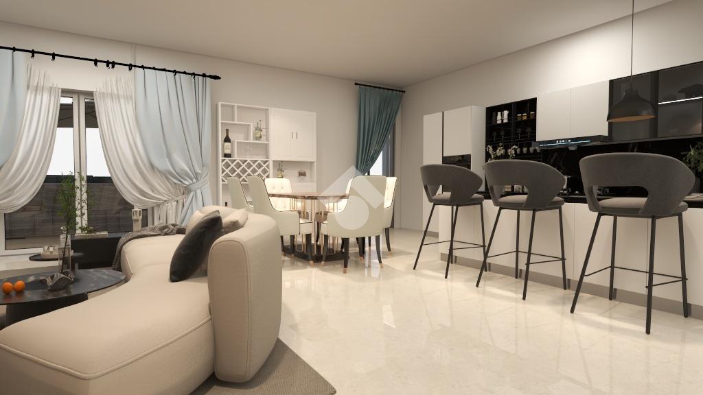 L’ingresso conduce a un luminoso soggiorno con sala da pranzo, collegato tramite un arco alla cucina a vista. Entrambe le aree sono dotate di ampie porte-finestre che permettono di accedere direttamente alla terrazza, valorizzando gli spazi e creando continuità tra interno ed esterno.