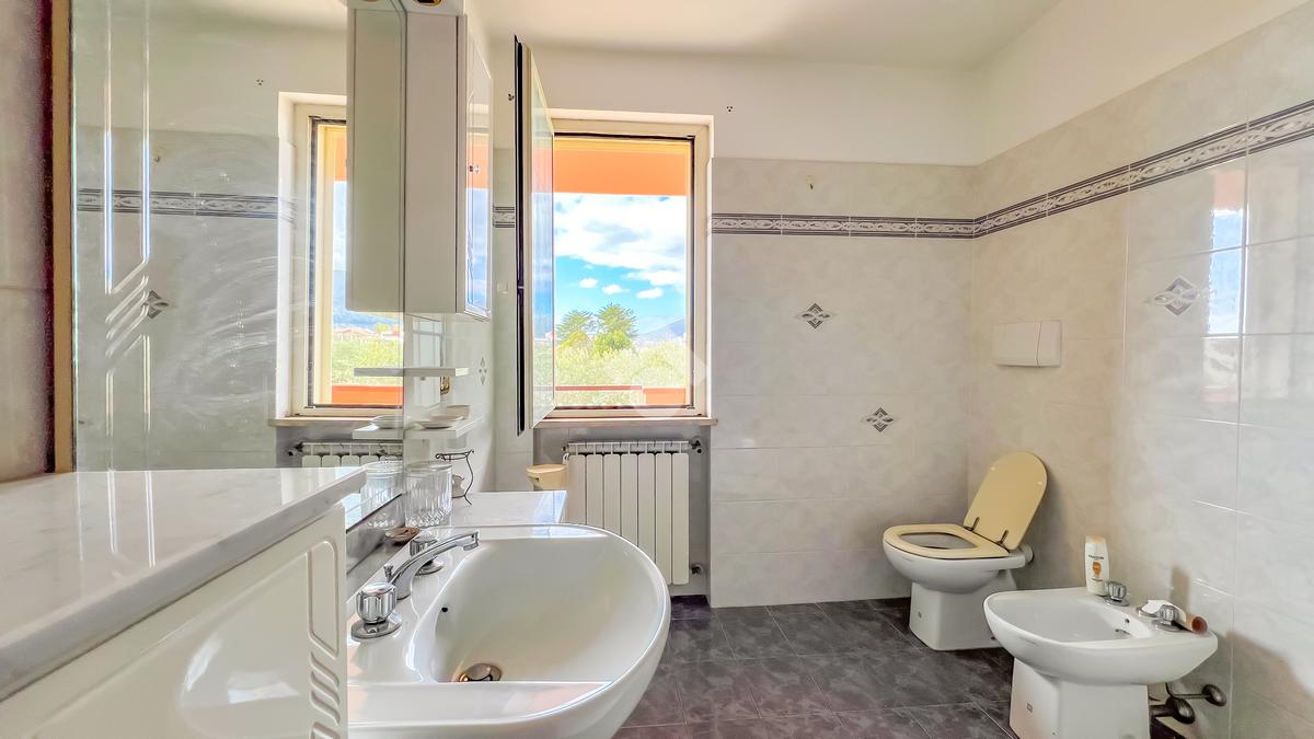 Al primo piano (110 mq calpestabili) un ampio disimpegno conduce alla zona notte composta da cinque camere: tre camere da letto con accesso diretto al terrazzo e una camera con balcone abitabile esposto a nord. Una delle camere dispone inoltre di bagno privato con box doccia.